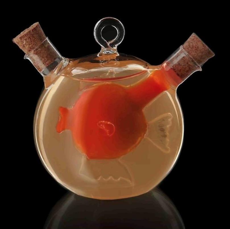 Une bouteille originale avec un second récipient en forme de poisson à l'intérieur deviendra une véritable décoration de table. En expérimentant avec des épices de différentes couleurs, vous pouvez créer diverses compositions intéressantes. La bouteille est en verre durable, le bouchon est en bois. Le volume d'une grande bouteille est de 420 ml, poisson - 50 ml. Taille - 12,4 x 10 x 12 cm.