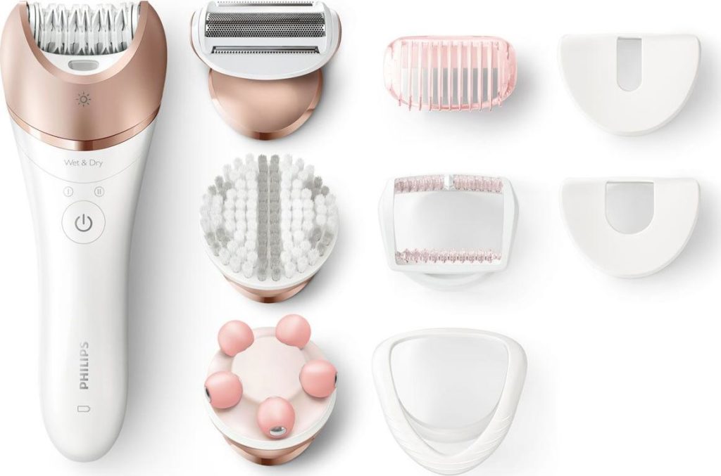 Aménagements supplémentaires. Le bundle étend considérablement les fonctionnalités de l'appareil. Ainsi, la tondeuse vous permet de raccourcir les poils, ce qui convient à la création de coupes de cheveux intimes. La buse pour l'épilation localisée est nécessaire pour le soin des aisselles et de la zone du bikini, ainsi que pour le visage. Le capuchon exfoliant fournit des soins supplémentaires de la peau. Une commodité supplémentaire sera la présence de bouchons hygiéniques pour les buses, d'un étui ou d'un sac cosmétique pour ranger l'appareil et les accessoires.