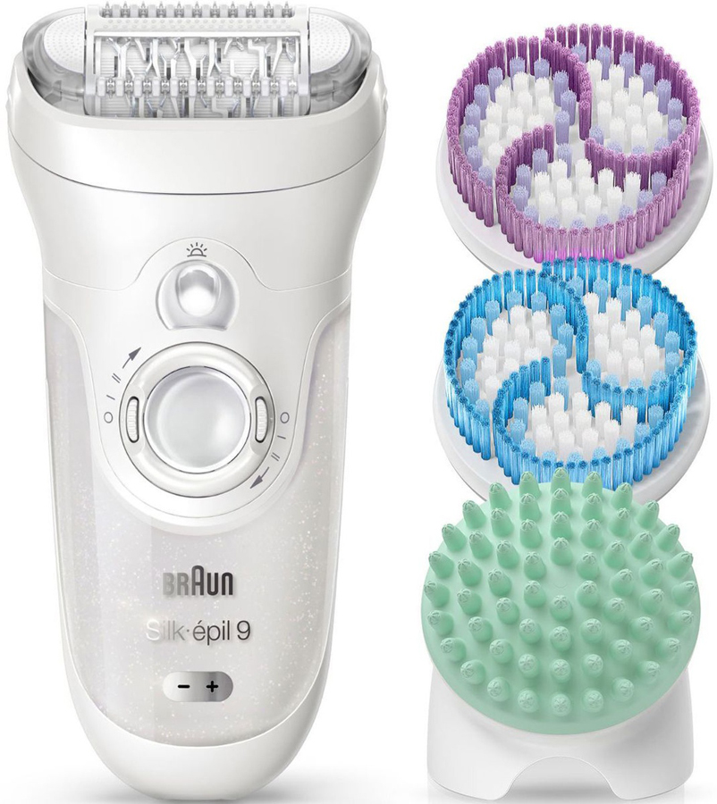 Un autre modèle polyvalent doté de la technologie SensoSmart : un capteur tactile contrôle la pression appliquée sur la peau pour un effet maximal. La partie large de la tête d'épilateur capture même les poils courts. Grâce au boîtier étanche, l'appareil peut être utilisé dans le bain ou sous la douche. Le modèle est livré avec des accessoires supplémentaires, tels qu'un soin du visage et une buse avec un limiteur pour l'épilation localisée, ainsi qu'un étui de rangement. Braun 9-700 fonctionne en 2 modes de vitesse. Pour un travail confortable, l'éclairage intégré est fourni. Les courbatures sont atténuées grâce au masseur qui soigne en douceur les zones les plus délicates de la peau. Le coût moyen est de 7 160 roubles.