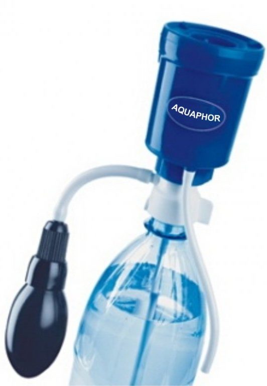 Option de filtre de voyage qui s'adapte à n'importe quelle bouteille en plastique standard. Pour utiliser l'appareil, vous devez le visser au goulot de la bouteille, créer une petite pression avec une pompe - et de l'eau propre s'écoulera à travers un tube spécial. Les avantages de l'appareil sont sa compacité, sa légèreté, sa facilité d'utilisation et sa polyvalence.