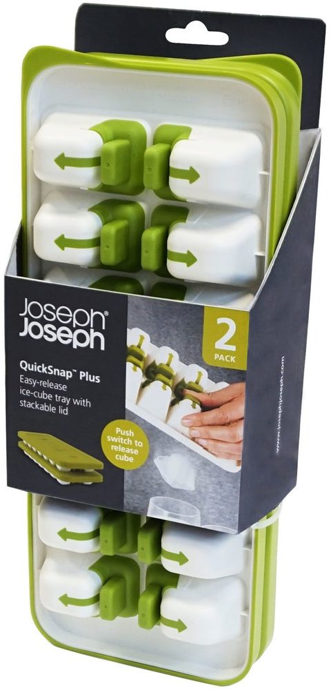 L'un des dispositifs innovants de congélation de la glace peut s'appeler le conteneur Joseph Joseph Quicksnap Plus, il est équipé d'un mécanisme spécial à bouton-poussoir, grâce auquel les cubes résultants sont facilement retirés. De plus, il a un couvercle solide et flexible pour permettre de placer d'autres récipients ou produits dessus. Il empêche également les odeurs ou les liquides étrangers de pénétrer à l'intérieur.Pour en extraire le contenu, il vous suffit de tourner légèrement le récipient, puis d'appuyer sur le bouton situé à l'arrière en respectant le sens des flèches indiquées dessus.