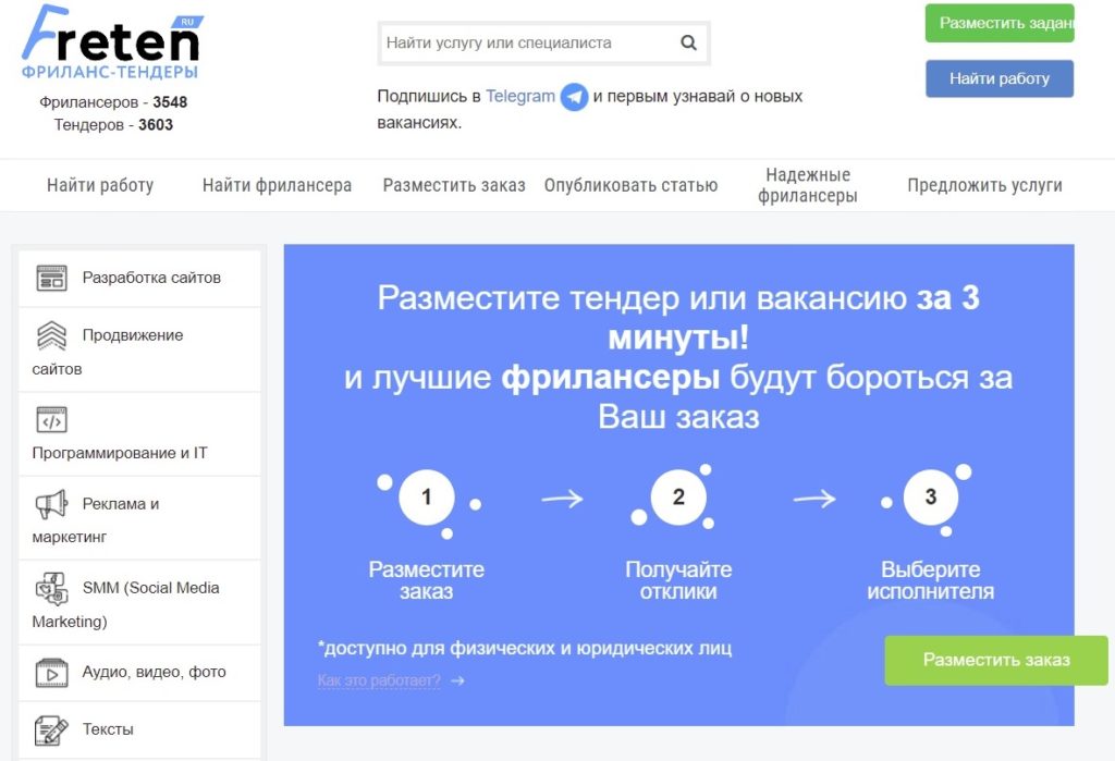 Créé en 2020, cet échange indépendant universel est entièrement gratuit et ne nécessite pas d'inscription obligatoire, il suffit de se connecter via votre compte Vkontakte, Mail, Gmail ou email Yandex. Le site Web Freten dispose d'un système de filtrage pratique où vous pouvez spécifier la spécialisation souhaitée de l'artiste, la ville, le coût des services, et également vérifier si un pigiste figure sur la liste blanche. Pour entrer dans la liste blanche et augmenter vos chances de recevoir des demandes fréquentes de clients, vous pouvez effectuer une tâche de test.