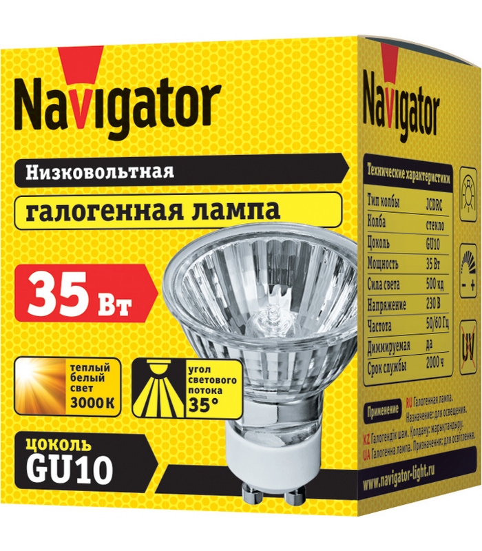 Forme d'ampoule reflex avec réflecteur et verre de protection. Type de culot GU5,3, broche. La longueur de l'ensemble de l'appareil est de 5 cm pour un poids de 41,5 g La température maximale de la lumière est de 3000 K à une puissance de 20 watts. Le modèle Navigator 94202 fonctionne grâce à un transformateur abaisseur.