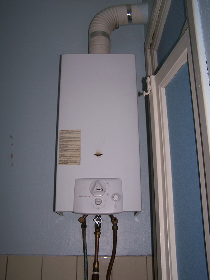Geyser avec chauffe-eau instantané, type classique. L'appareil est équipé de l'ensemble nécessaire de fonctions, thermomètre, affichage et interrupteurs. Fixation murale à la verticale.