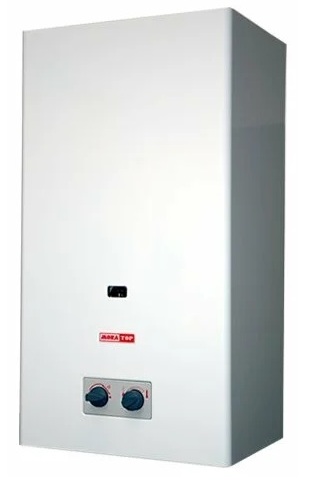 Chauffe-eau à circulation d'eau à gaz avec une chambre de combustion ouverte et un allumage piézo. En sortie, il maintient automatiquement la température de l'eau, l'appareil est équipé d'un limiteur de chauffe liquide, d'une commande mécanique et d'une commande gaz.Quant à l'installation : verticale, avec raccordement par le bas. Conception simple : boîte en métal rectangulaire blanche avec leviers de commande d'oscillation noirs.