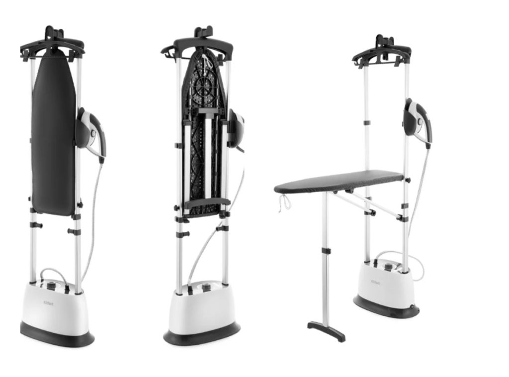La conception préfabriquée du KT-940 combinait une planche à repasser, un support de vapeur, un fer à vapeur avec une brosse. Permet de repasser les textiles horizontalement et sur cintre. Caractérisé par la stabilité.Confortable et sûr à utiliser.