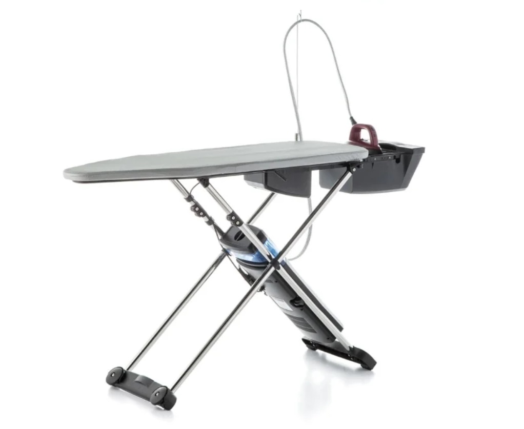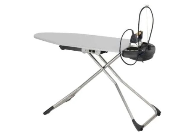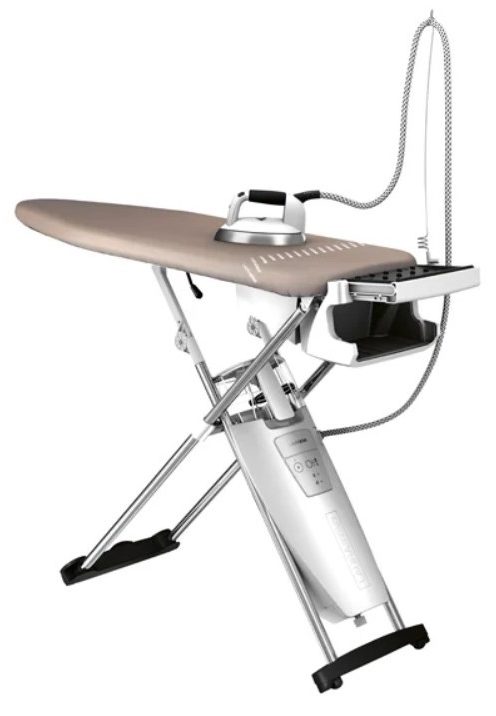 La planche est équipée des fonctions suivantes : pressurisation - crée un coussin d'air sous le tissu ; vide - fixe les vêtements pour qu'ils ne glissent pas. L'étagère à linge permet de gagner de la place.