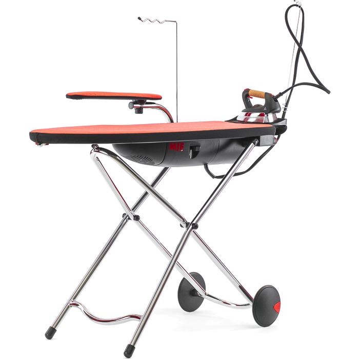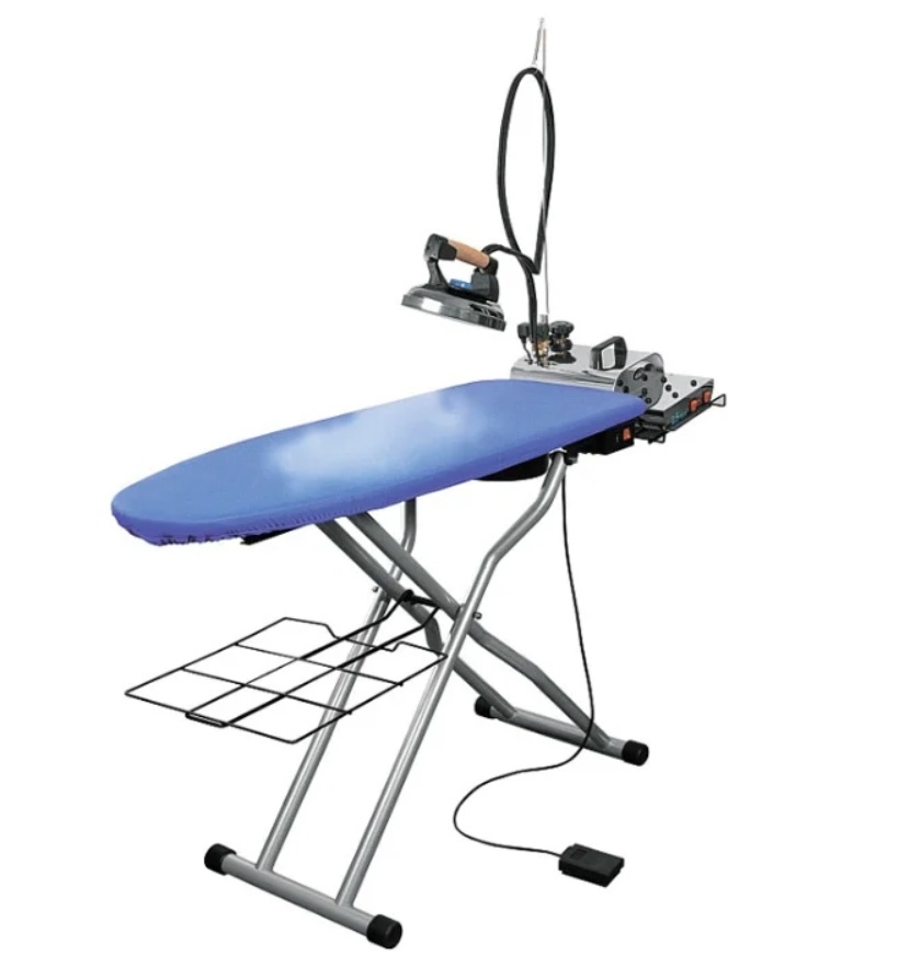 Système de repassage moderne avec générateur de vapeur, planche et fer à repasser. Le kit comprend une plate-forme pour les manchons, les buses, les bateaux, les palettes, les cintres, les mitaines et autres accessoires de protection.