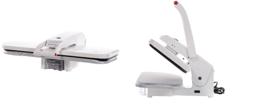 Équipé de vide, pressurisation, chauffage. La soufflerie pour un repassage doux est assurée par un ventilateur, la hotte fixe solidement le tissu sur la surface de la table.
