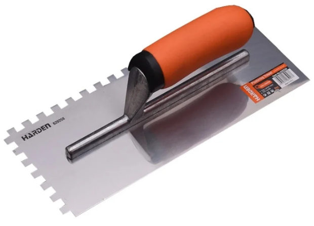 Il s'agit d'une truelle crantée de Harden, qui est sur le marché depuis 20 ans et est représentée dans 50 pays. La lame est en acier allié. Il a des propriétés anti-corrosion en raison de la teneur en chrome. Cela signifie que même avec un mauvais entretien, il n'y aura pas de rouille. La plate-forme elle-même est dure, peu sujette aux dommages.