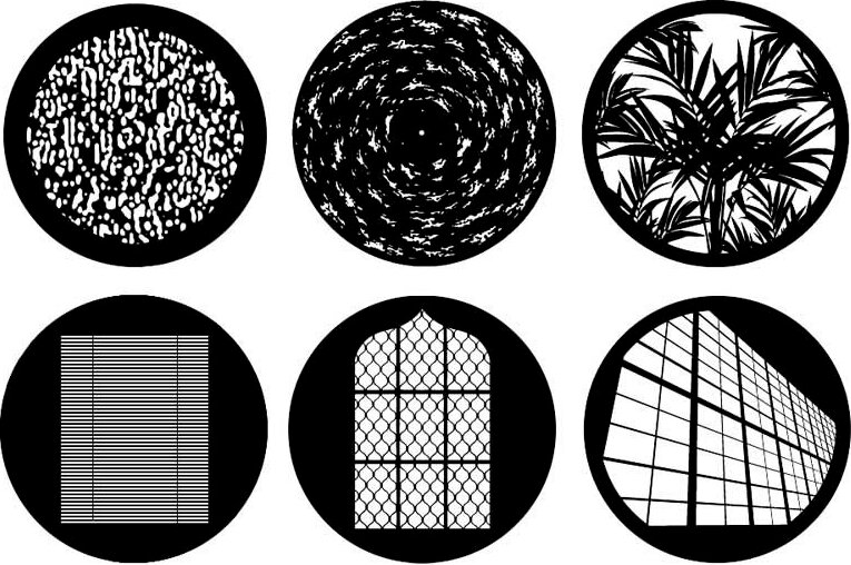 Gobo - un motif avec des motifs imprimés ou découpés, une police. Une source de lumière vive, traversant un tel pochoir, crée un motif, une image sur n'importe quelle surface (murs de maisons, plafonds de couloirs, trottoirs).