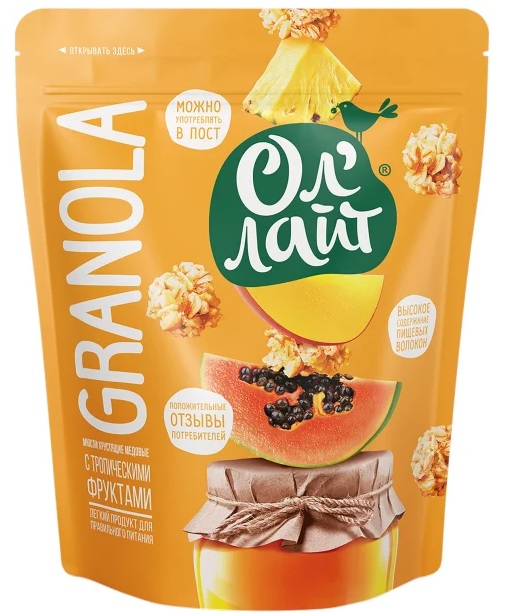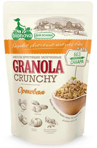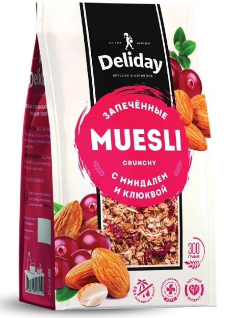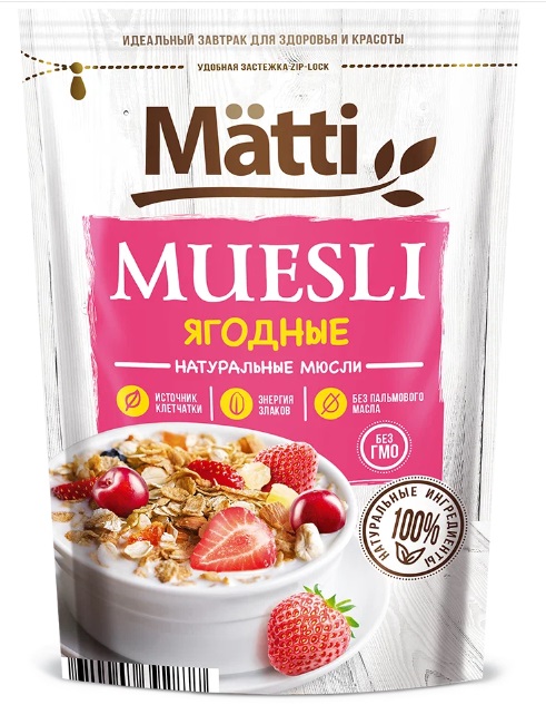 Ingrédients : produits céréaliers (flocons de blé, flocons de seigle, flocons d'orge, flocons d'avoine), mélange de baies séchées (raisins, cerises, fraises, farine de riz, sucre, correcteur d'acidité - acide citrique, colorant - carmin), malt d'orge léger extrait, graines de tournesol, amandes, pétales torréfiés.