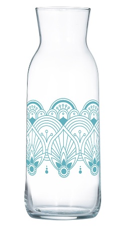 Modèle en verre ressemblant à une bouteille à large goulot. Grâce à cette fonctionnalité, il est facile de verser des boissons dans un récipient sans accessoires supplémentaires. Le produit convient pour servir de la limonade, de l'eau, du jus. Des motifs bleus complexes sont appliqués sur la partie centrale des plats.