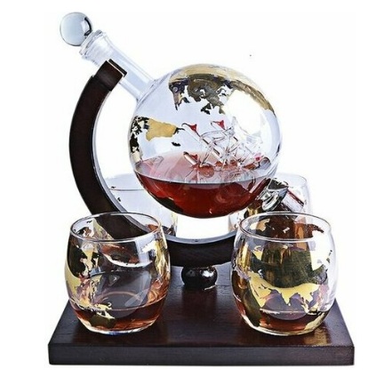 Livré avec 4 tasses à whisky, une carafe globe, un support en bois et un imprimé doré. La principale caractéristique du produit est la présence d'un vaisseau tridimensionnel en verre à l'intérieur de la sphère de verre. Sur les murs de la sphère, une carte du monde est appliquée avec de la peinture dorée. Les tasses ont également un design plaqué or. Le volume nominal de la carafe est de 920 ml, le diamètre est de 14 cm et la hauteur assemblée est de 19 cm.