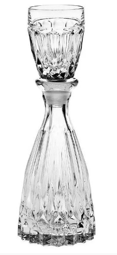 Service en cristal pour une personne pour boire de la vodka de la société Crystal Bohemia, présenté sous la forme d'une carafe avec un bouchon et un verre, d'une contenance de 140 ml. Dans une paire de 2 articles ressemblent à un sablier.Une carafe à base large et à col étroit, un verre à shooter à base étroite et à haut large. Le bouchon est en cristal, avec un grand bouchon lisse, qui sert de support à un verre.