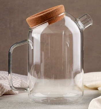 Un produit écologique en verre, équipé d'une poignée, d'un bec verseur pour verser des boissons, d'une large ouverture avec un couvercle en liège à travers lequel le liquide est versé. Taille du produit (voir) : 17/10,5/18,6 ; poids - 415 g.