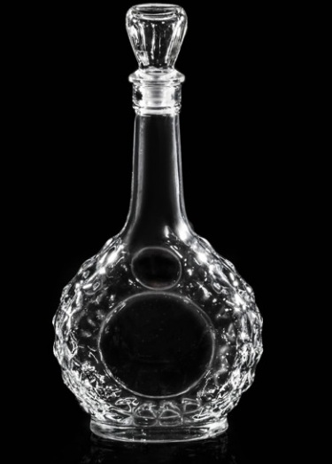 Produit avec couvercle en verre pour boissons alcoolisées fortes, vin. Sa hauteur est de 21 cm, son volume est de 500 ml. Le diamètre de la partie médiane est de 10,5 cm, le fond est plat, la bouche est large, le bouchon est en verre.