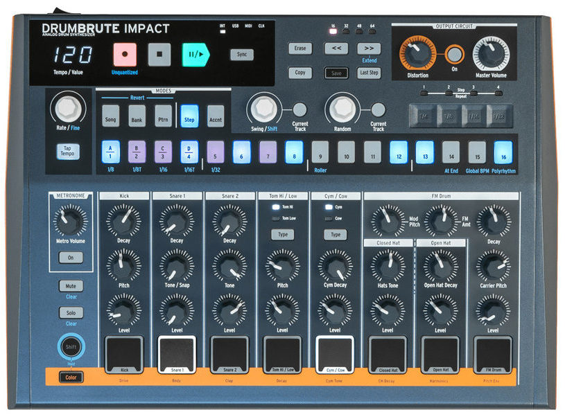 Boîte à rythmes compacte pour la maison et le studio de la société suédoise Elektron avec un séquenceur MIDI intégré. Avec lui, vous pouvez créer, traiter et enregistrer les pistes de l'auteur. Le système chargera automatiquement 8 modèles d'usine la première fois que vous l'allumerez. Vous pouvez les remplacer en un seul mouvement.
