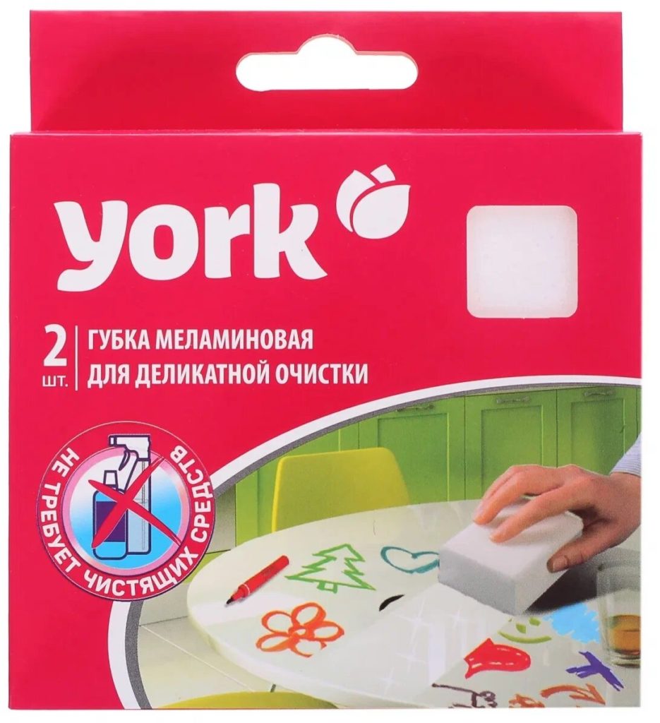 La mélamine du fabricant "York" ressemble à un rectangle blanc. Vendu sans étui plastique ni imprégnation. Au lieu de plastique, l'entreprise utilise une boîte en papier contenant deux morceaux de caoutchouc mousse de mélamine mesurant 11,5 × 6,2 cm.Les instructions d'utilisation sont placées au verso. Il n'y a pas d'odeur toxique sèche ou humide.