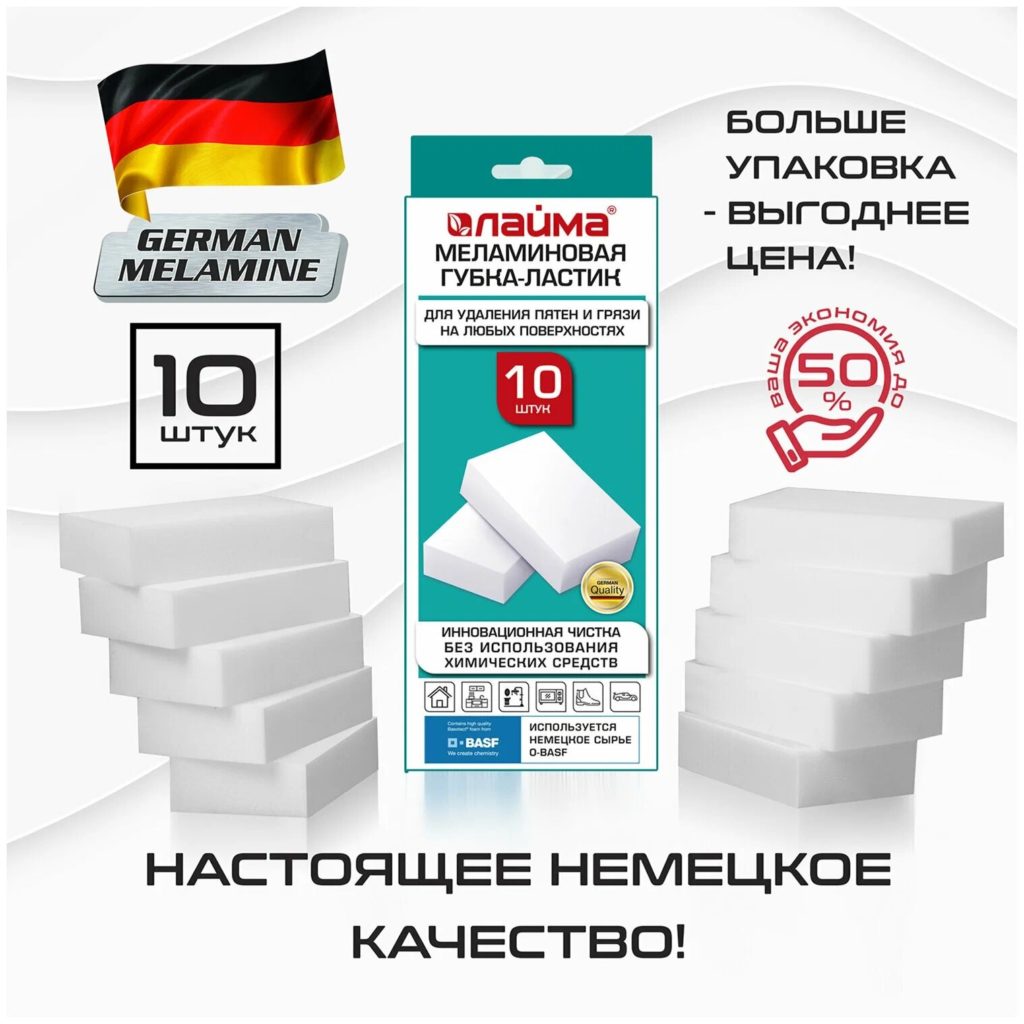 Le modèle Laima est un caoutchouc mousse rectangulaire blanc sans étui et aucune crème. Une boîte contient 10 pièces. Pour ce type de fonds, ce montant n'est pas suffisant. Une éponge suffit pour 3-4 applications, puis elle devient inutilisable. Cela est dû au fait que cette mélamine ne conserve pas bien sa forme après le nettoyage. Il attire la saleté, il est donc recommandé de couper périodiquement ces éponges.