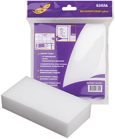 Éponge en mélamine pour éliminer le tartre et la rouille des surfaces. Grâce à des technologies innovantes, les pores microscopiques décomposent rapidement les molécules de graisse et les éliminent. Après utilisation, rincer abondamment à l'eau tiède et laisser sécher. Coût : 257 roubles.