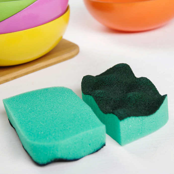 L'éponge acrylique avec l'ajout de caoutchouc mousse et de polyester est durable, ne s'effrite pas, ne se décolle pas avec une utilisation constante. Le paquet contient 2 pièces de la même taille, de couleurs différentes. Dimensions : 8x8 cm Prix moyen : 374 roubles.