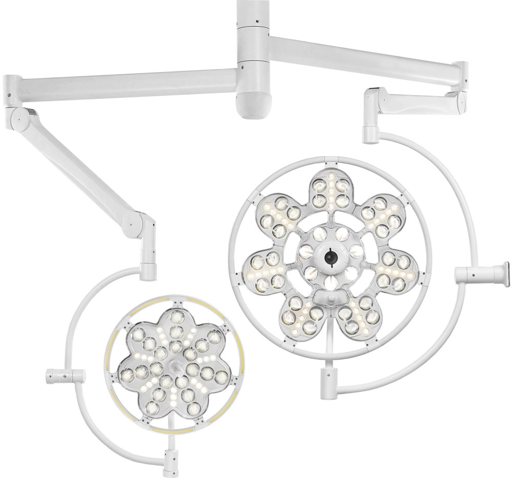 Ces modèles représentent des installations de plafonniers à double dôme. La présence de lampes LED dans leurs conceptions permet aux médecins d'effectuer des opérations de plusieurs heures sans s'exposer à la lumière intense des appareils sur les yeux. Ces luminaires ne déforment pas la couleur et transmettent toutes les nuances naturelles, et excluent également le chauffage de la zone éclairée. Les lampes à LED appliquées conduisent à la rentabilité des installations, augmentent leur sécurité, augmentent la durée de vie. Ils n'émettent pas de rayonnement infrarouge ou ultraviolet. Le fonctionnement pratique et simple avec une télécommande facilite le réglage des fonctions nécessaires. La conception de montage vous permet d'ajuster et de fixer la position confortable de l'unité, jusqu'à une rotation de 360°.