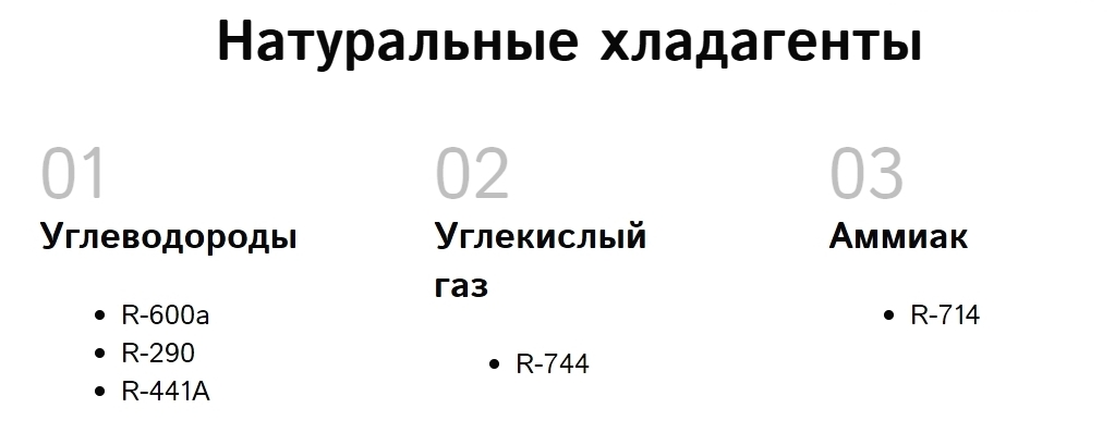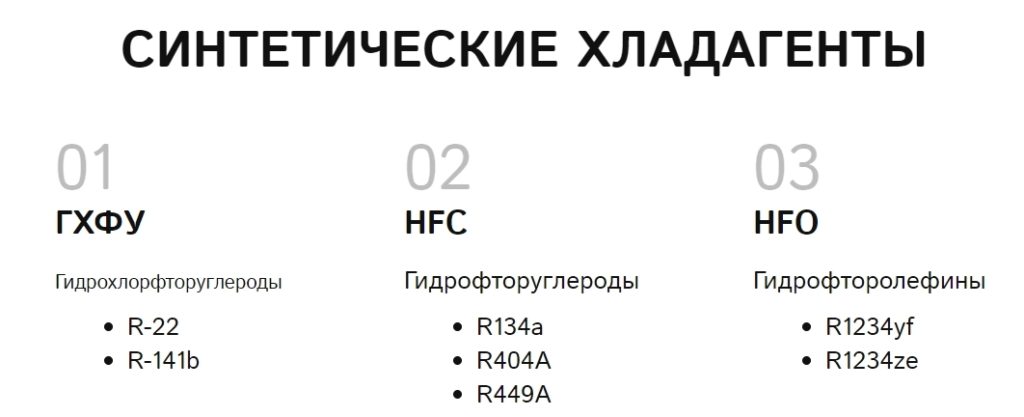 Le refroidissement des équipements commerciaux, des compresseurs à pistons centrifuges, des climatiseurs est assuré par des réactifs spéciaux : R-134a, R-22, R-404A, R-507 et R-410A. De nombreux composés utilisés aujourd'hui sont divisés en deux groupes de composés :