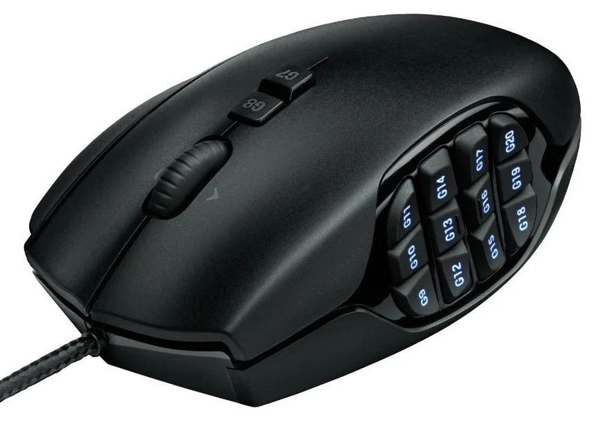 L'une des options budgétaires pour une souris de jeu est le modèle Logitech G600. En plastique, de construction massive avec une molette pour le défilement horizontal et 20 boutons et incluant la possibilité de les reconfigurer, c'est un système de contrôle qui remplace le clavier standard. La conception incurvée des boutons situés à la fois sur le dessus et sur les côtés rend l'utilisation de l'appareil confortable et vous permet également d'utiliser presque tous les doigts.Tous les boutons disposent d'un rétroéclairage RVB personnalisable. La texture mate sur le côté droit du luminaire garantit que votre main est fermement en contact avec la souris, ce qui permet de la tenir plus fermement et d'effectuer les mouvements nécessaires précis.