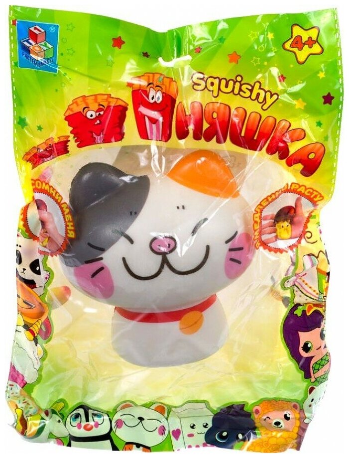 Squishi Nyashka se présente sous la forme d'un chat tricolore à la japonaise. Fabriqué à partir de polymère ordinaire avec l'ajout de couleurs noires et rouges. Il pèse 50 grammes et mesure 9x4 cm.