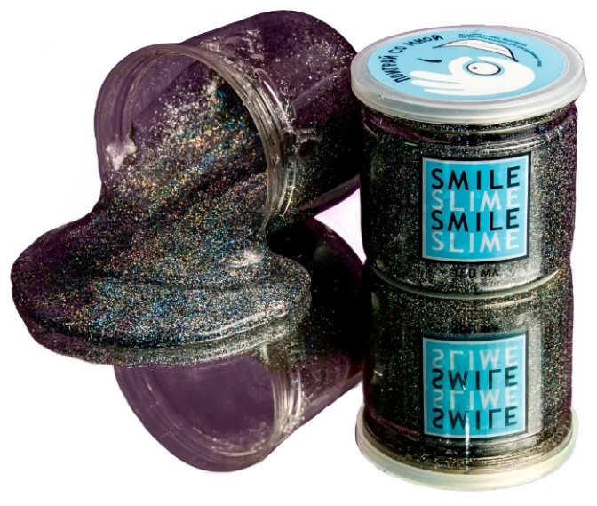 La densité de Smile Slime est bien inférieure à celle des jouets anti-stress précédents. Sa consistance ressemble plus que d'autres au mucus en raison de la combinaison de polymère et d'eau. La couleur principale est le noir, mais de nombreux éclats irisés y ont été ajoutés, créant une association avec le ciel étoilé. Le volume du produit est de 150 ml. Conserver dans le bocal en plastique fourni avec le couvercle. Pour fixer ce dernier, une légère pression est nécessaire.