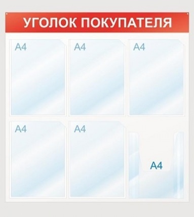 Ce modèle de stand d'information vous permet de placer 5 feuilles au format A4, et il existe également un département où vous pouvez placer des livrets d'information, dont la taille ne dépassera pas le format A4. Pour la fabrication du support, du plastique de 4 mm d'épaisseur a été utilisé et les poches étaient en plastique transparent d'une épaisseur de 0,5 mm. Pour le département, conçu pour accueillir les doublures, le fabricant a utilisé de l'acrylique. Son épaisseur est de 2 mm. Le "bouchon" du produit est en film, a un fond rouge et des lettres blanches.