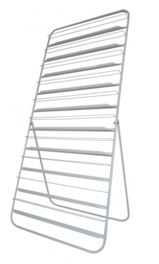 Ce modèle est en métal et a un design pliable et pliable. Il y a 10 étagères où vous pouvez placer des brochures, des magazines ou d'autres documents imprimés. Une fois assemblé, la taille du produit est de 200 * 90 * 53,5 cm et une fois démonté - 110 * 92 * 10 cm.