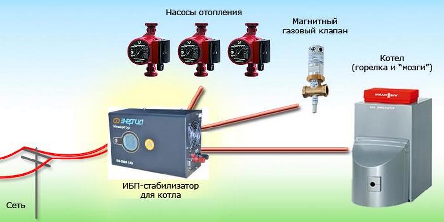 Les chaudières à gaz d'aujourd'hui, en plus du combustible de base, doivent également être alimentées en électricité. Il alimente plusieurs composants à la fois : une pompe de circulation, un module d'allumage, un boîtier GSM et ventilation, une carte de contrôle. Toutes ces pièces doivent fonctionner en permanence, même en cas de coupure de courant. Pour cela, il est nécessaire d'équiper les chaudières d'alimentations indépendantes (sans interruption), elles sont également des onduleurs. Une telle source continuera non seulement à alimenter l'équipement pendant une panne de courant, mais empêchera également les conséquences dangereuses (par exemple, l'épuisement des cartes de circuits imprimés) lors d'une panne de courant soudaine.