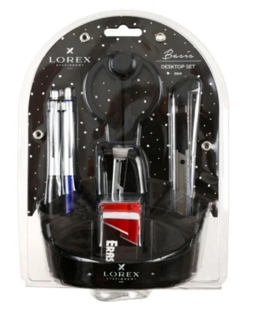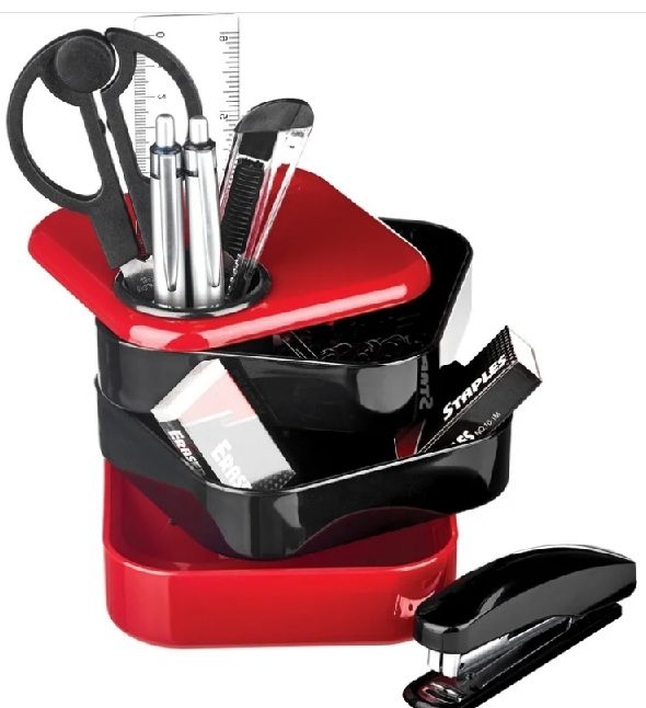 - une agrafeuse, des agrafes et des trombones sont inclus avec l'ensemble standard d'un stylo, d'un crayon, d'un couteau, d'une règle et de ciseaux ;