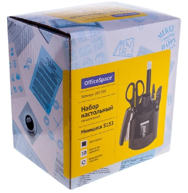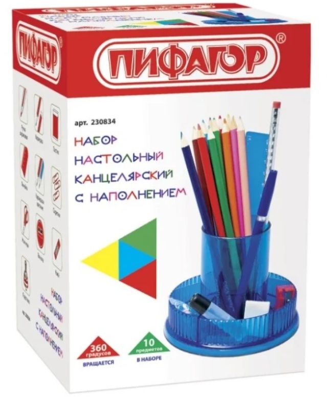 Un ensemble d'un fabricant russe bien connu, qui soutient les nouvelles tendances, est représenté par un support profilé avec une base rotative et des articles de papeterie de haute qualité.