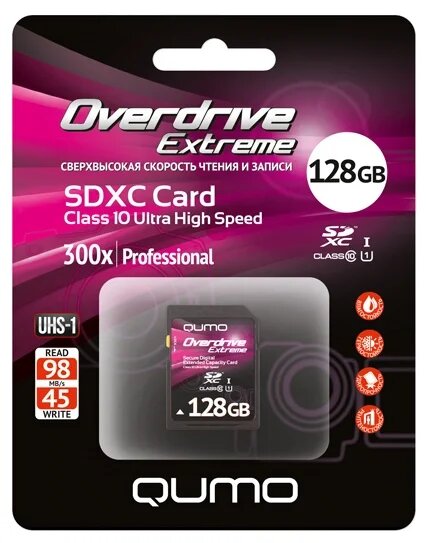 Overdrive Extreme SDXC enregistre des données jusqu'à 256 gigaoctets, a une vitesse assez élevée et prend en charge UHS-1. Peut être connecté via USB, dispose d'un adaptateur SD.