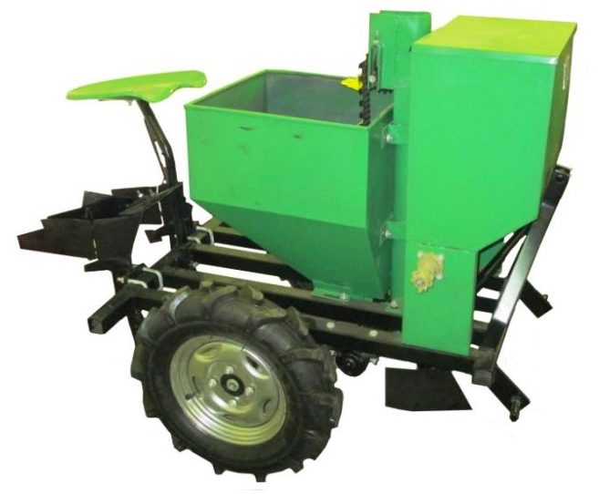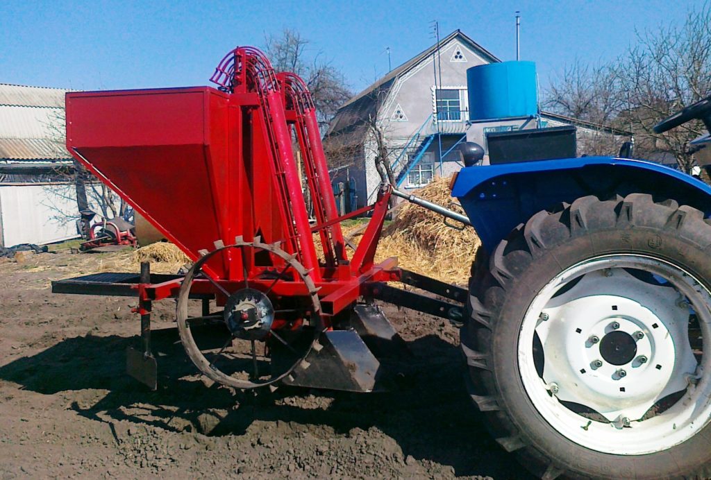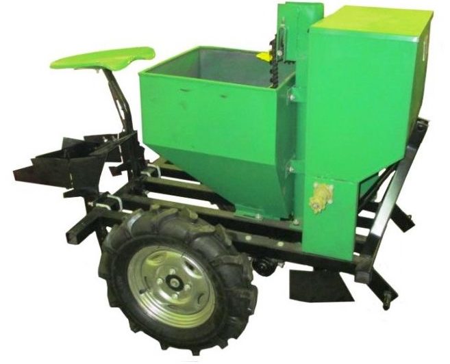 Un dispositif conçu pour la plantation saisonnière de pommes de terre. Il a la forme d'accessoires, agrégés au tracteur. La principale caractéristique est le rendement élevé. Mécanise complètement le processus, réduit le temps de travail, réduit considérablement les coûts de main-d'œuvre. Fabriqué par une société chinoise. Il commence à agir simultanément avec le mouvement du mini-tracteur.