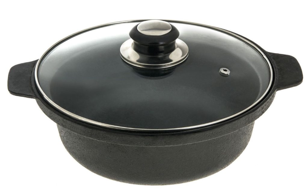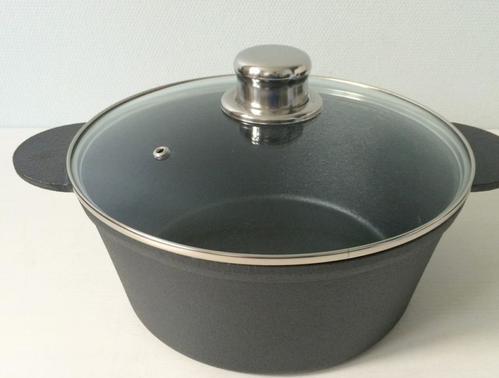 Les modèles en fonte sont très populaires. Après chauffage, ils conservent longtemps la chaleur et contribuent à l'élaboration de produits dans leur propre jus. L'avantage du modèle est que le matériau n'est pas endommagé même en cas d'utilisation fréquente. Vous pouvez utiliser le produit sur un feu ouvert, mais le couvercle doit être retiré pour le four. Le modèle est lourd, il doit donc être lavé uniquement à la main.
