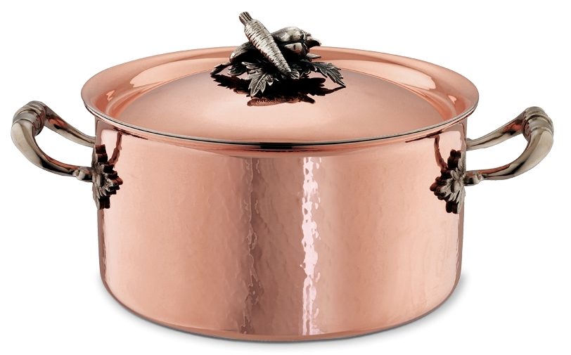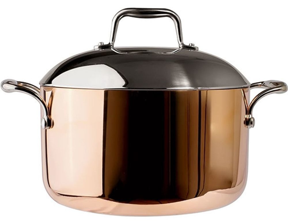 Modèle de la marque italienne Ruffoni, qui présente une surface en cuivre doré dont le relief est réalisé à la main par gaufrage. Les poignées décoratives sont en acier inoxydable, le couvercle est décoré d'une composition de légumes et de feuilles, ce qui ajoute de la sophistication aux plats. Le matériau est à trois couches - le côté extérieur est en cuivre, le côté intérieur est en acier inoxydable et au centre se trouve une couche en aluminium. Le cuivre répartit uniformément la chaleur à l'intérieur de la batterie de cuisine et, grâce à la présence d'une couche d'acier, la casserole gagne en résistance. Ruffoni Opus Cupra convient à la cuisson des spaghettis, des entrées, des légumes à l'étuvée. Dans le même temps, le goût et les propriétés nutritionnelles des produits ne changent pas. Fonctionne bien avec tout type de plaque de cuisson sauf l'induction. Diamètre 16 cm Le coût moyen est de 27 990 roubles.