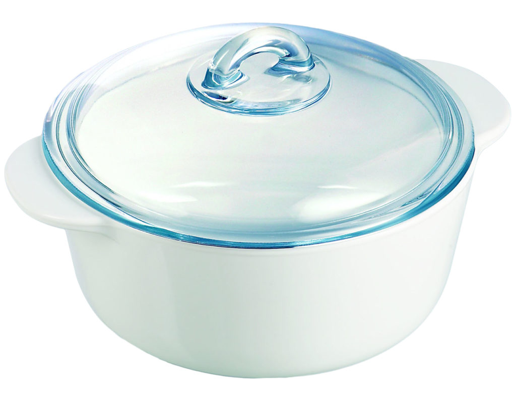 Modèle en vitrocéramique à haute résistance à la chaleur. Ces plats peuvent être utilisés sur tout type de cuisinière, à l'exception de l'induction, ainsi qu'au micro-ondes et au four. Pyrex Flame a un design élégant, il peut être utilisé pour le dressage de table. Le couvercle est en verre résistant à la chaleur, les poignées sont en céramique. La surface intérieure ne tache pas après la cuisson, n'absorbe pas les odeurs étrangères. Le produit peut être lavé au lave-vaisselle. Le diamètre est de 21 cm et le coût moyen est de 1 442 roubles.