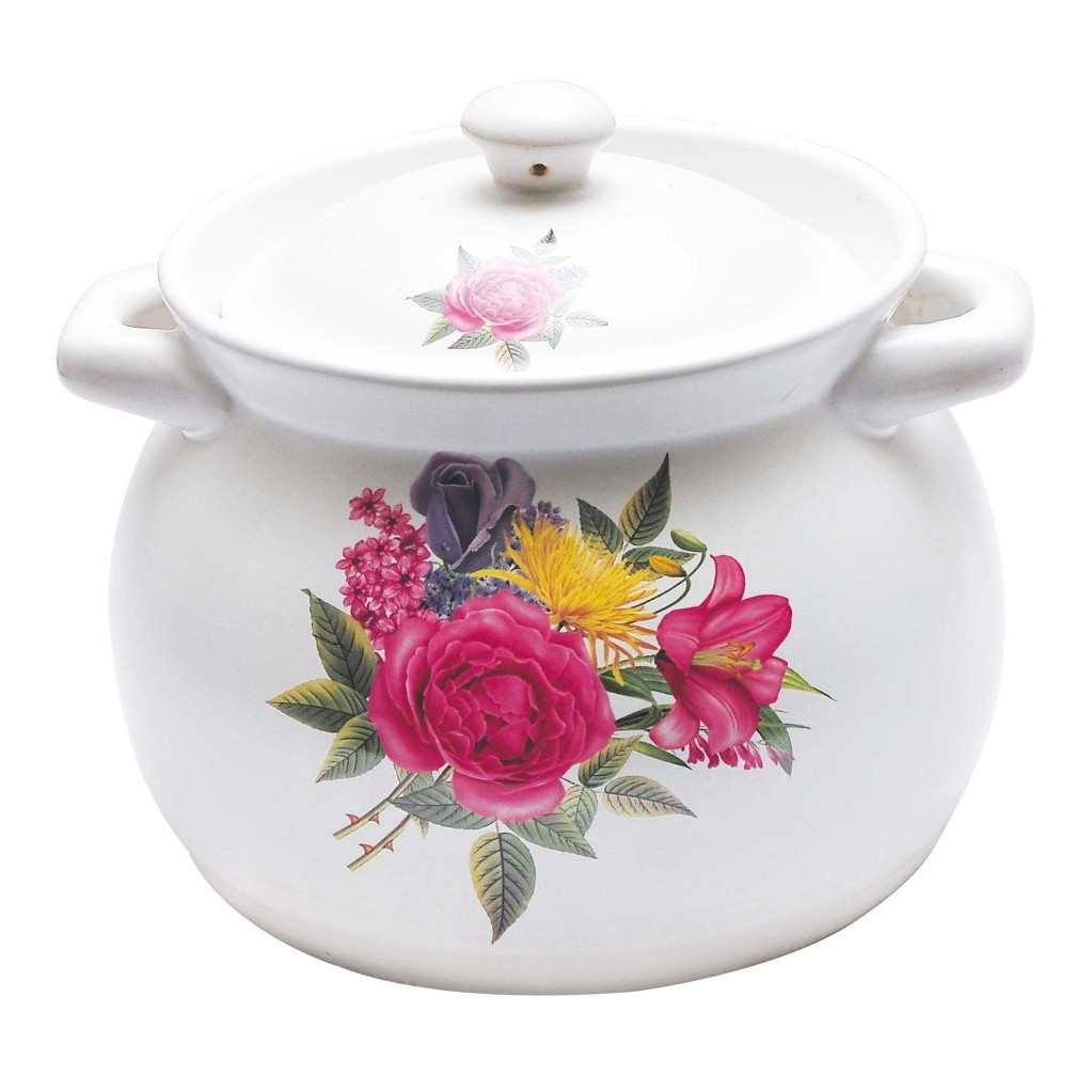 Pot en céramique de style classique aux formes arrondies. Conserve la chaleur à l'intérieur pendant longtemps, grâce à quoi le processus de cuisson est plus rapide. Le modèle est fabriqué dans un matériau sûr et respectueux de l'environnement qui n'accepte pas les odeurs étrangères. Les aliments sont chauffés uniformément sans brûler ni coller à la surface. Couvercle en céramique inclus. Les poignées latérales sont fabriquées dans le même matériau.Le produit peut être lavé au lave-vaisselle et peut également être utilisé au four. Le fond est monocouche de 4 mm d'épaisseur. Le diamètre supérieur est de 19 cm et le coût moyen est de 1 430 roubles.
