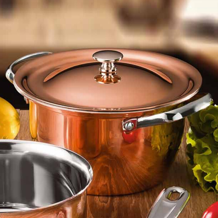 Le modèle du fabricant portugais a une conductivité thermique élevée, de sorte que les produits sont chauffés uniformément et rapidement mis en état de marche. Le poids est faible, même rempli, la vaisselle reste peu lourde.Copper Crafts convient aux plaques de cuisson électriques, à gaz et à induction. Le diamètre supérieur est de 18 cm, l'épaisseur inférieure est de 4 mm. Le kit comprend un couvercle en cuivre. Les poignées sont fixées avec des rivets. Le coût moyen est de 6 490 roubles.