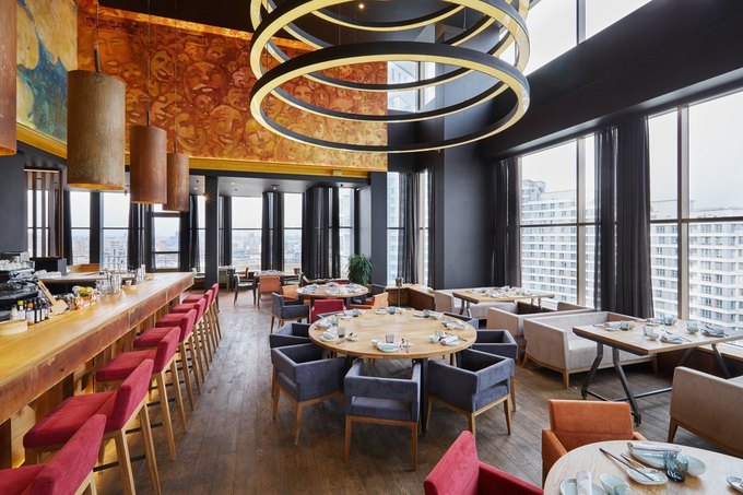L'intérieur du restaurant est fait de matériaux écologiques. Et le soir c'est très beau ici à cause des fenêtres panoramiques.