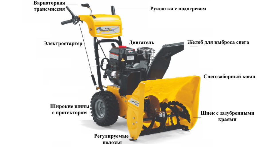 Modèle automoteur à roues pour le déblaiement de petites surfaces. L'installation d'une tarière à dents permet d'écraser une couverture de neige dense. Les roues avec une bande de roulement profonde offrent une excellente capacité de cross-country et ne glissent pas. Un levier spécial régule la rotation de la goulotte. Le moteur à essence est conçu pour fonctionner à basse température et peut facilement faire face à n'importe quelle charge. Il est complètement autonome et ne nécessite pas de sources d'énergie externes.