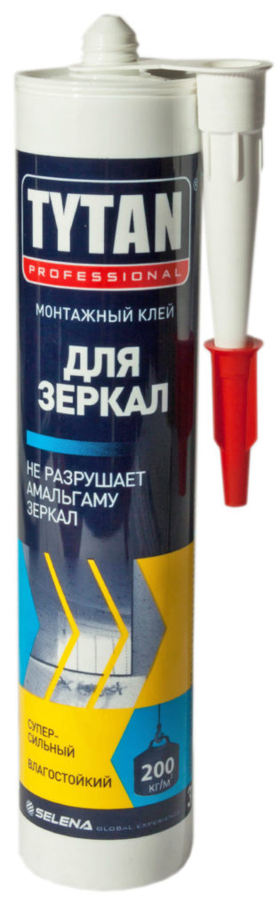 Silicone. Chimiquement neutre, ce qui élimine l'apparition de réactions indésirables lors de l'interaction avec différents types de matériaux. Crée un film solide qui maintient fermement le miroir à la base. Le temps de séchage d'un tel adhésif est plus long que celui des formulations à base de solvant. Le coût de la colle est plus élevé que la version précédente.