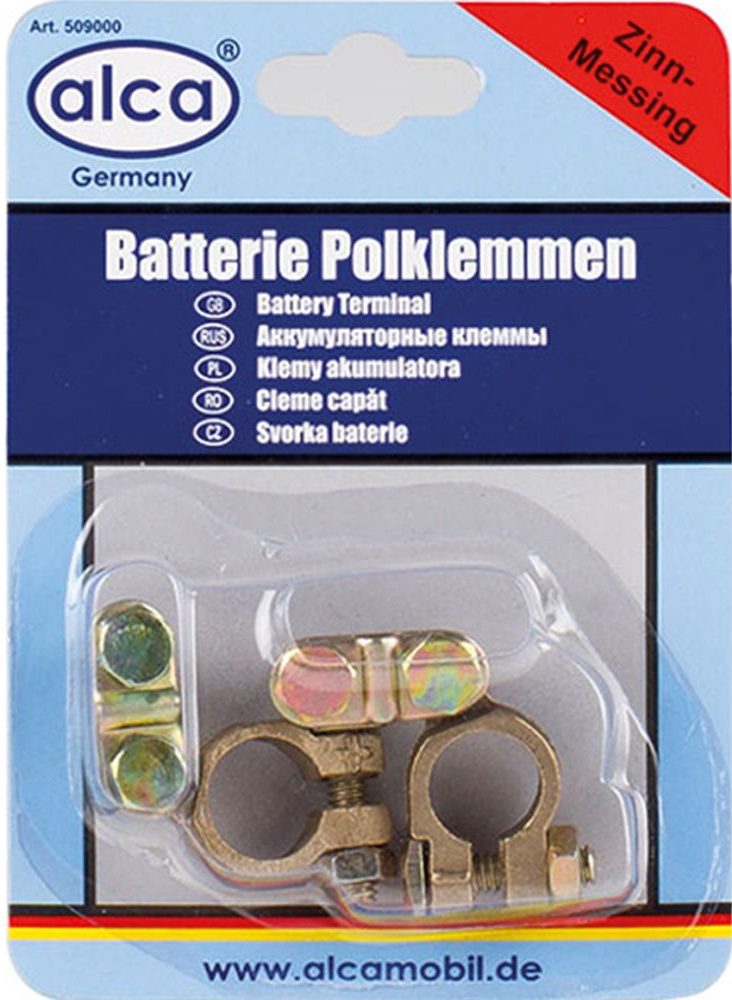Modèle d'un fabricant allemand. Bien que les accessoires de cette marque soient fabriqués en Chine, le résultat répond aux normes de qualité allemandes. L'entreprise est populaire auprès des automobilistes et jouit d'une réputation de production de pièces fiables. Le modèle 509000 est composé d'un alliage de laiton et d'étain. Une telle connexion offre une conductivité de courant stable, une forte adhérence aux cellules de la batterie et une résistance réduite. L'ensemble comprend 2 pièces. dimensions de 110 par 119 mm et 50 mm de hauteur. Le coût moyen du modèle est de 250 roubles.