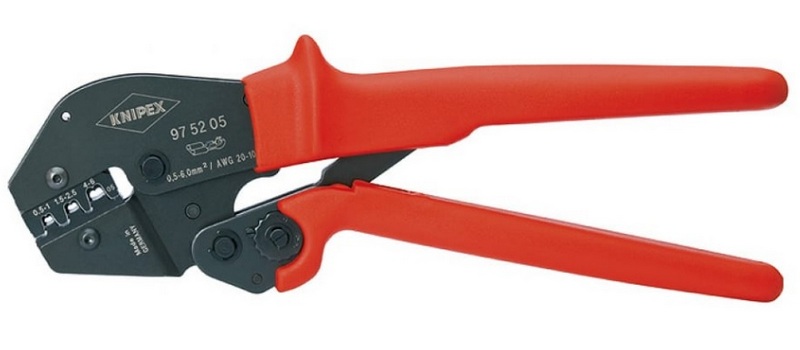 La première option est la plus populaire. Le processus de sertissage s'effectue en pressant les deux mâchoires de travail sur le corps de la férule avec le fil. De telles pinces à sertir diffèrent des pinces ordinaires par la présence d'évidements correspondants sur les mâchoires de travail, qui sont le garant d'une fixation solide du consommable au câble et établissent la connexion la plus fiable. La commodité d'utiliser une pince pour le sertissage réside dans le fait qu'il n'est pas nécessaire de sélectionner la bonne position du consommable, car l'action (haut / bas) peut être effectuée de n'importe quel côté. Cependant, vous devez surveiller attentivement que la pointe s'adapte à la matrice (évidements dans les mâchoires de travail).