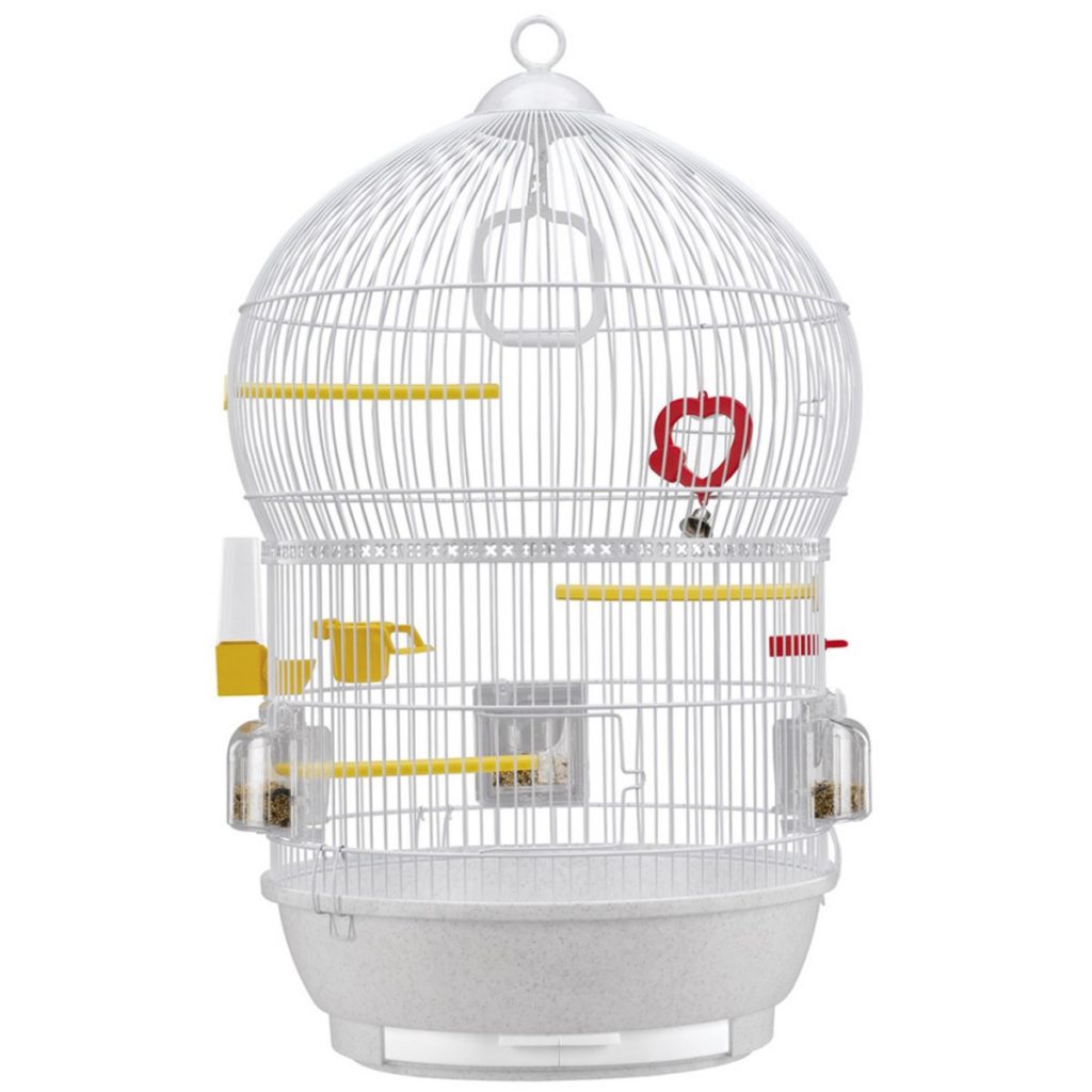 La forme semi-circulaire de la cage la rend compacte, le modèle s'installe au sol ou en table de chevet. Les portes battantes s'ouvrent largement, ce qui facilite l'entretien. La hauteur de la structure est de 76 cm, elle est donc idéale pour plusieurs animaux à plumes.
