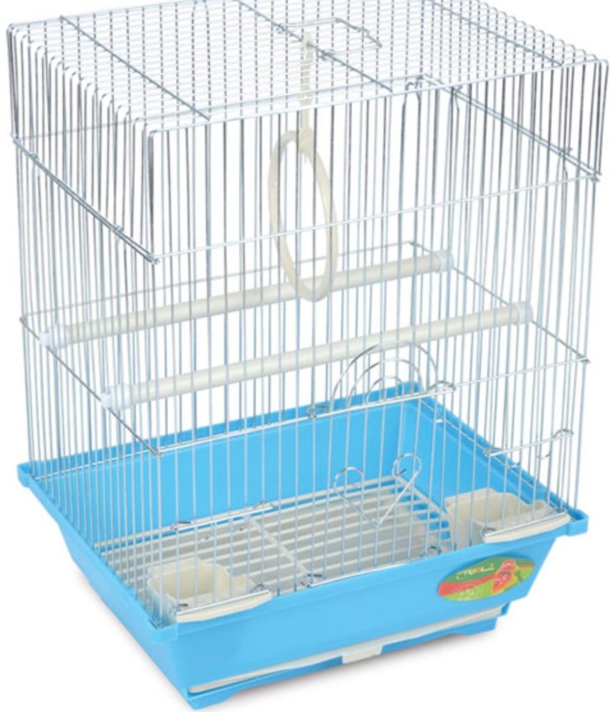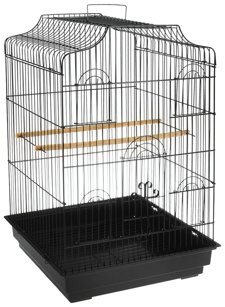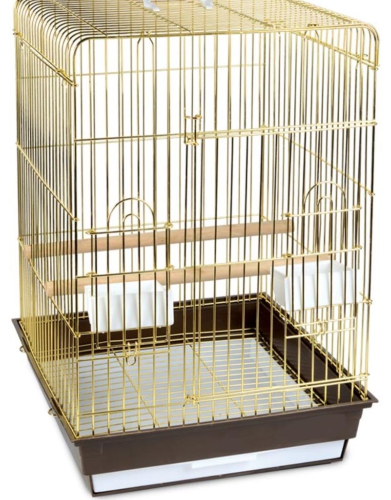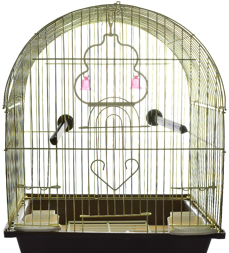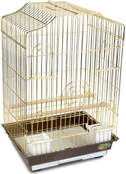 Une petite "maison" pour petits oiseaux exotiques sera longtemps un havre de paix. Ses dimensions sont les suivantes: longueur - 30 cm, profondeur - 23 cm, hauteur - 39 cm La distance entre les barres longitudinales est de 1,08 cm, ce qui assurera la sécurité des perroquets. Prix dans les 900 roubles. La palette est en plastique et recouverte d'une grille spéciale pour éviter de blesser les animaux domestiques. Le design est en métal, recouvert d'"or" et est équipé de tout le nécessaire pour un séjour confortable des animaux de compagnie :